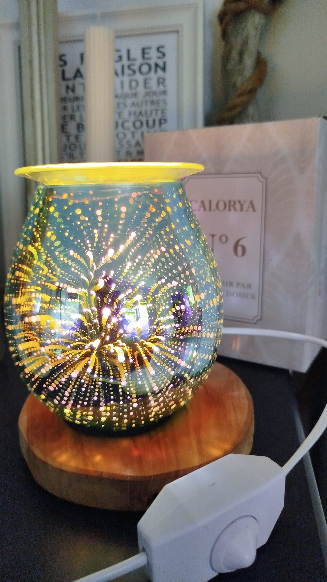 Le diffuseur Calorya N°6 fonctionne par chaleur douce et propose un design aux motifs 3D uniques. Sa robe en verre incurvée créée des effets de lumières en 3D trompe l’oeil absolument superbes.
